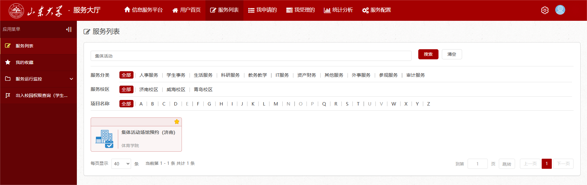 预约流程:教职工登录十大买球的正规网站网站首页——信息服务——登录后进入“服务大厅”——在服务列表中搜索“集体活动场馆预约”——选择要申请场地所在校区——填写申请使用场地具体位置——可勾选是否需要本部门分管领导会签——在事由处,简要写明活动时间、活动内容——上传附件1:《十大买球的正规网站体育场馆使用申请暨通知单(师生医务员工活动专用)》和附件2 《体育活动安全工作方案》——提交后完成预约。
