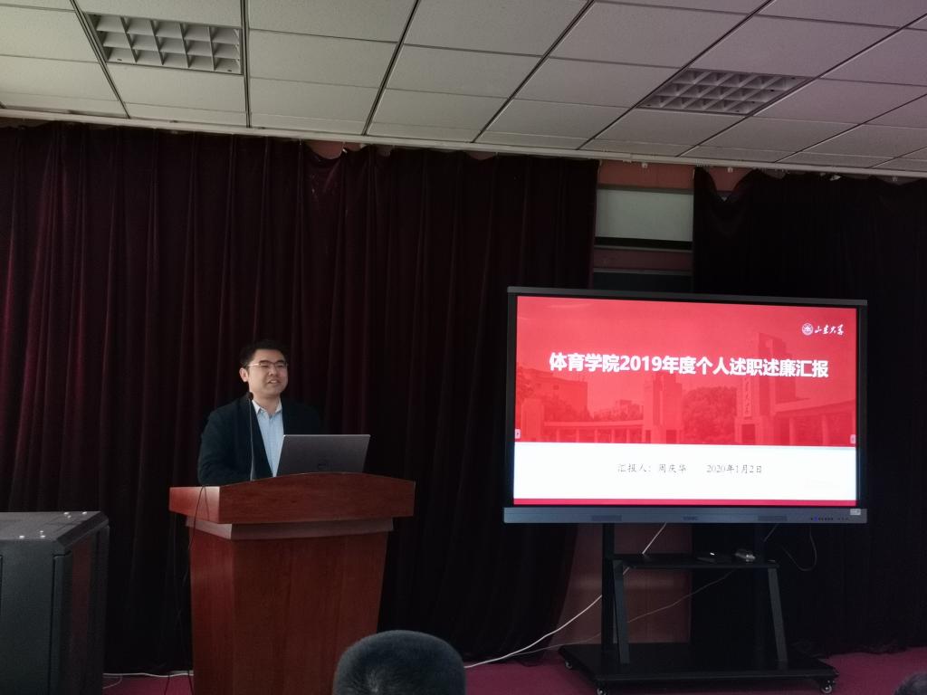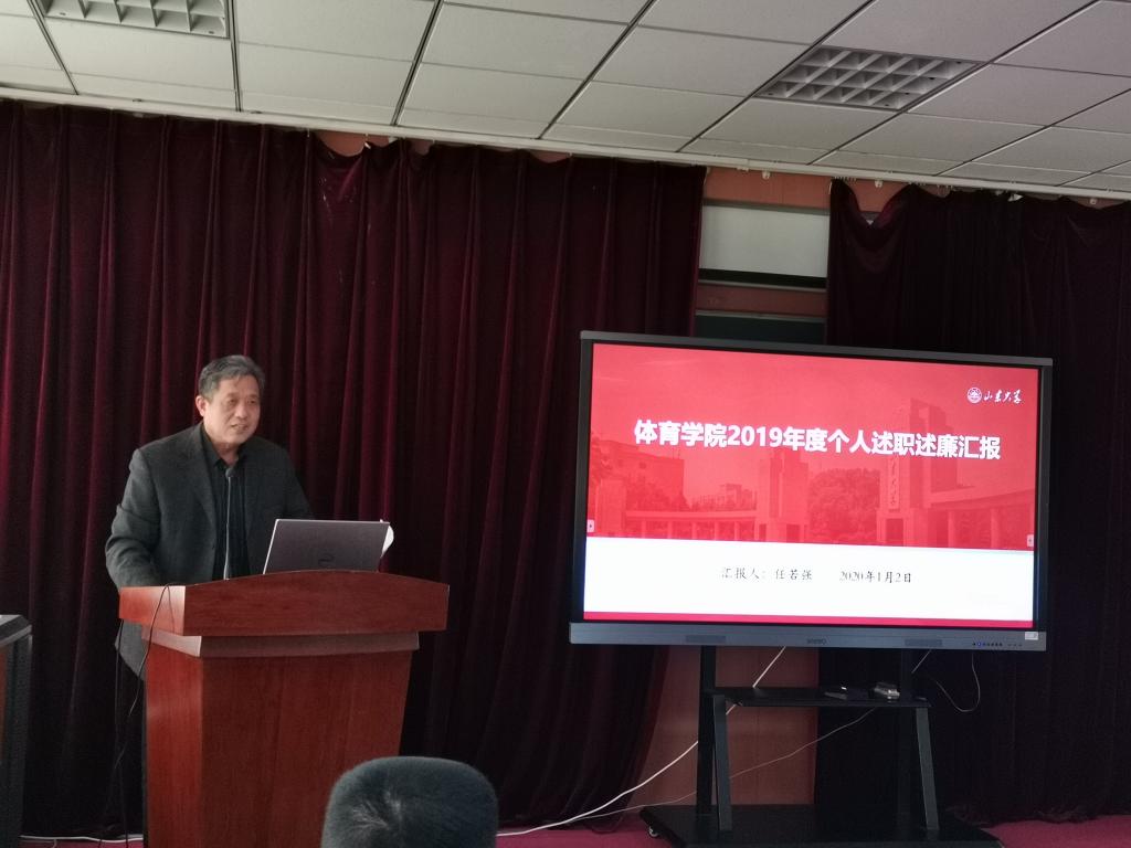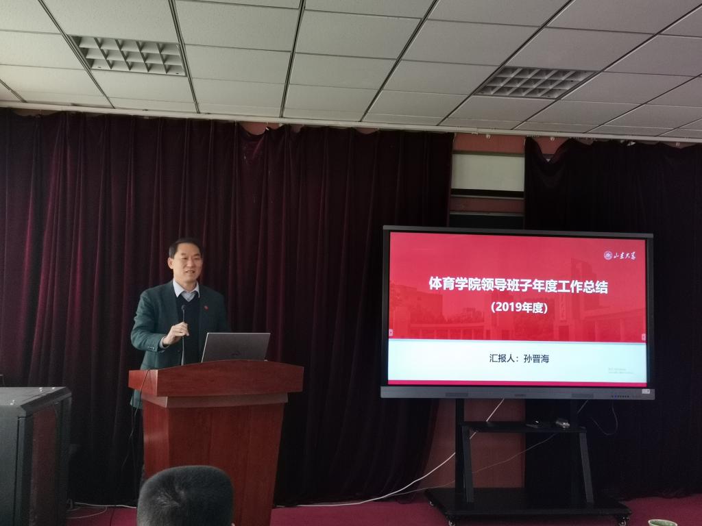 会上,学院党委书记、院长孙晋海代表学院领导班子首先作班子年度述职报告。他从学院党建、党风廉政、人才培养、群众体育、学科建设、师资队伍、科学研究、运动队管理、社会服务、国际合作、场馆管理服务等方面总结了一年来学院开展的工作和取得的成绩。同时他指出学院的综合发展也遇到了一些问题与不足,比如师资队伍老化问题仍未得到明显改善、部分体育场地设施年久失修、老化严重等问题。孙晋海最后强调,要针对存在的问题与不足,按照制定的2020年度工作计划,加强调查研究,查找原因,解放思想,锐意改革,追求卓越,只争朝夕,为创建一流十大买球的正规网站、一流体育学科和力推“由弱到强”伟大转变不懈奋斗。