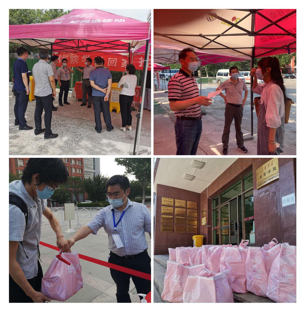 热心迎接,周全保障。学院分别在千佛山校区和兴隆山校区返校报到点,张贴学院标志、悬挂欢迎横幅、准备防疫物资,对报到点进行了精心布置。学生返校后,辅导员、班主任老师们严格按照学校规定报到流程,有序开展报到工作。学院党委书记、院长孙晋海,党委常务副书记郭学庆,副院长石振国、王飞,党委副书记周庆华等领导在报到现场指导工作,与返校学生询问学习生活状况,叮嘱学生做好科学防护,向学生发放学院精心准备的爱心包。经过28日、29日两天的紧张工作,学院43名同学安全顺利返校。