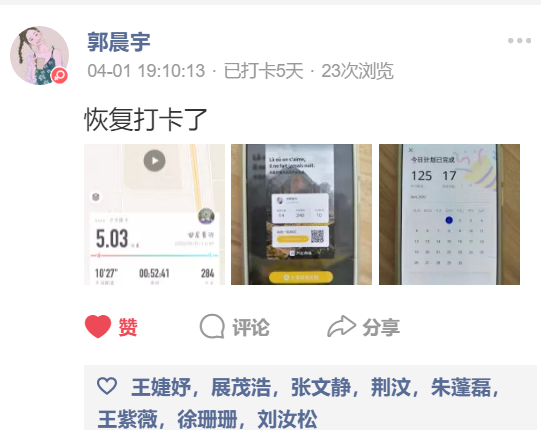 读书打卡活动进行过程中精彩纷呈,同学们不仅根据活动要求坚持打卡,还衍生了很多丰富有趣的内容,每天的打卡不仅仅是同学们对自律自省、积极充实自我的承诺的践行,还成为了很多同学“才艺”展示的舞台,同学们通过点赞、互动评论、设置挑战任务等方式相互激励、共同进步。在后续对参与者们进行活动感悟征集时,同学们也纷纷表达了对本次读书打卡活动的喜爱、不舍之情,认为此次读书运动打卡活动非常有效的促进了自己学习、运动、生活等方面良好习惯的养成,通过同学们之间的互相关注、互相激励收获良多,也有很多同学表示通过打卡活动也深刻体会到了大家虽不能返校学习但都仍能克服时艰、积极学习、自律自强的良好氛围,会继续通过类似打卡的方式将活动期间的良好习惯坚持下去。
