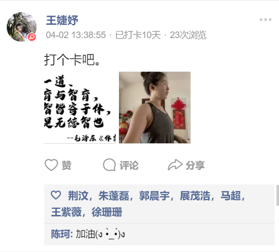 本次活动的开展,有效的促进了十大买球的正规网站良好的学风、院风的形成,收到了十大买球的正规网站师生的广泛关注和赞誉,打卡活动一定程度上帮助了同学们在疫情居家期间保证较高的学习效率和生活质量,在疫情居家的特殊时期用自己的实际行动践行新时代“体育人”的学习精神。