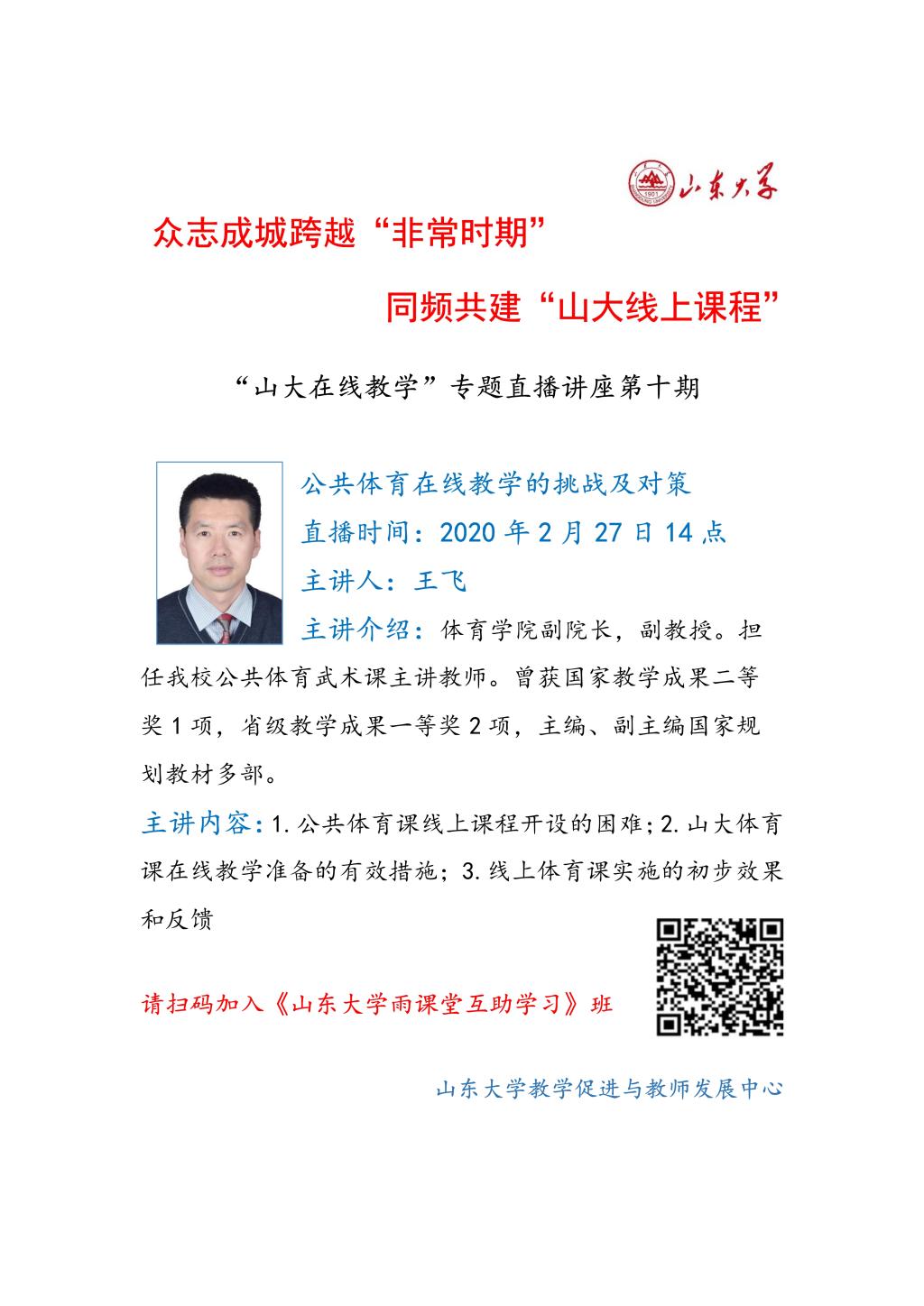 众志成城跨越“非常时期”。2月27日,十大买球的正规网站副院长王飞主讲的“山大在线教学”专题直播讲座成功举办。王飞以“公共体育在线教学的挑战及对策”为主题,通过雨课堂的在线教学形式,从国家与学校的政策、公共体育课线上课程开设的困难、山大体育课在线教学准备的有效措施、线上体育课实施的初步效果和反馈等四个方面内容进行了全方位解读。本次讲座实现了线上交流、开放共享、山大为主、面向全国的显著成效,据雨课堂后台数据统计,该讲座签到人数840人,参加学习交流的学院来自全国各地。搭建了疫情期间线上体育教学的平台,让全校、全省乃至全国的体育教师和广大学生受益。