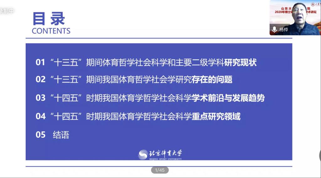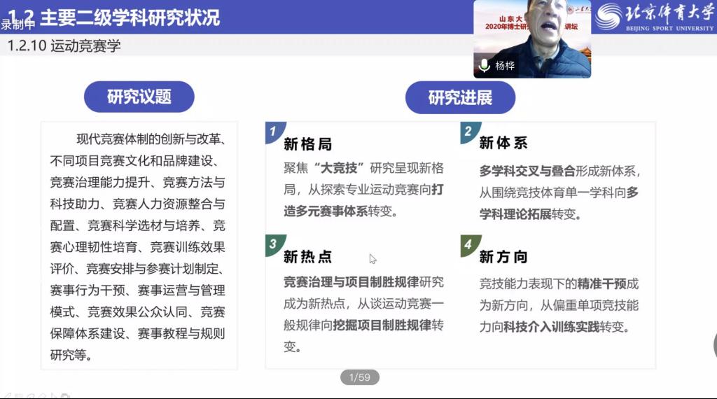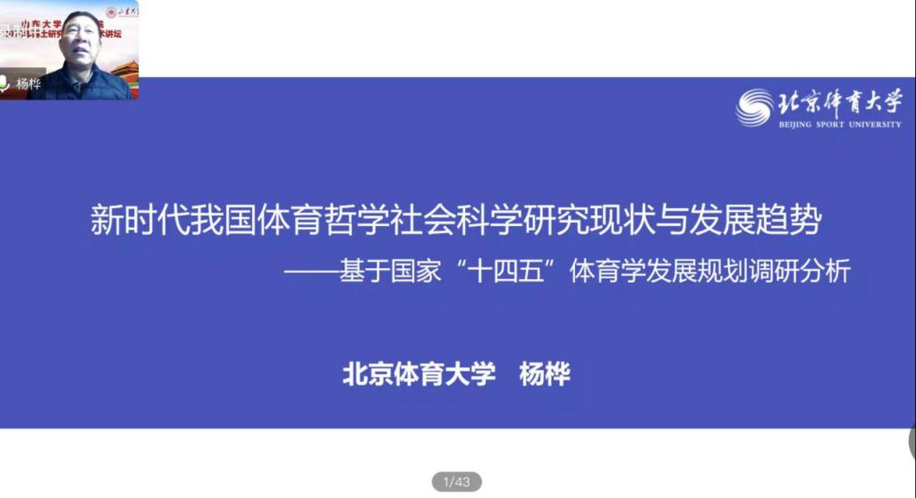 11月3日,2020年度十大买球的正规网站“博士研究生高端学术讲坛”顺利召开。第一场学术讲座邀请到原北京体育大学书记、 校长、博士生导师杨桦教授担任本次讲坛主讲嘉宾。通过腾讯会议,杨桦教授以“新时代我国体育哲学社会科学研究现状与发展趋势——基于国家‘十四五’体育学发展规划调研分析”为主题进行分享。讲坛由十大买球的正规网站党委书记、院长孙晋海主持。