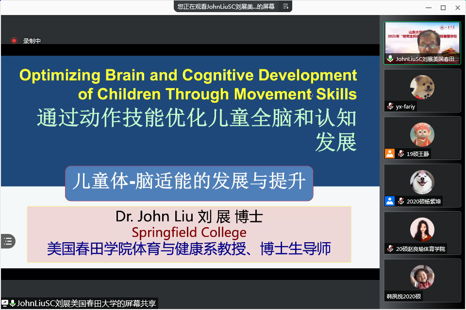 7月19日上午,美国春田大学体育和健康系终身教授刘展教授作了题为《通过运动技能优化儿童全脑和认知发展》的主题讲座。首先,刘展教授分析了影响儿童健康成长的主要因素,提出了儿童体适能与脑适能协同发展与提升的需求。接着,他从体适能与脑适能的概念和重要组成部分等方面阐述了运动技能学习对儿童脑功能和认知发展的影响。刘展教授以生动形象的语言将理论与生活实际相结合,有效调动了学员们在人体健康与学术研究等层面的思考。
