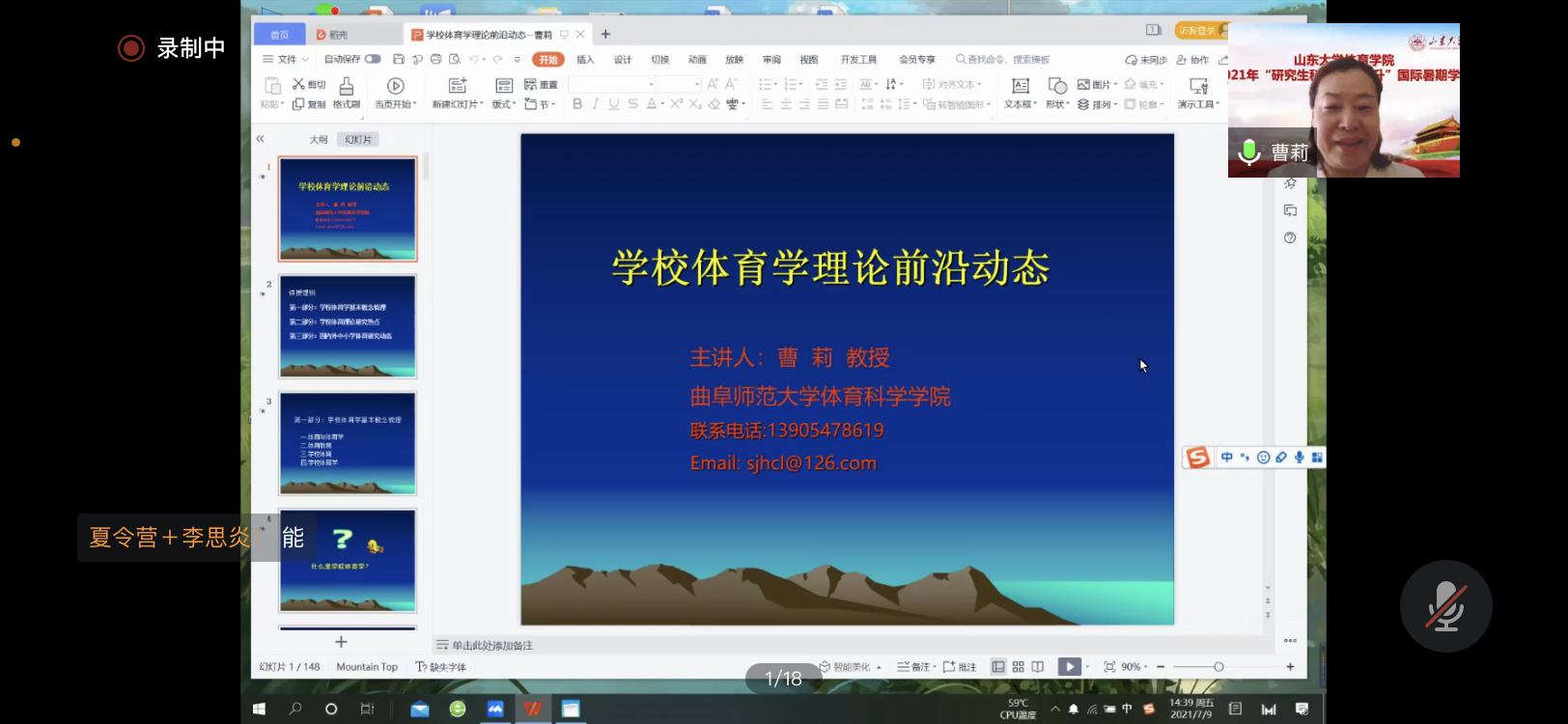 7月9日下午,曲阜师范大学体育科学学院院长曹莉教授做客十大买球的正规网站暑期学校,她以《学校体育学理论前沿动态》为题,从学校体育学基本概念梳理、学校体育理论研究热点和国内外中小学体育研究动态三方面展开讲座内容。曹莉教授认为现阶段学校体育应加强体育锻炼与学习、品质、心理等关系研究,进一步强化实用的体育课教学改革研究,开展好校园足球、篮球等活动,开发好校本课程,实现课内课外一体化、体育活动协会化、体育竞赛常态化。