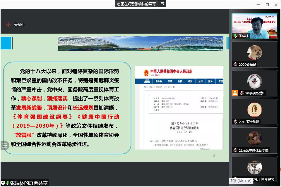 7月14日下午,吉林省体育局局长张瑞林教授做客十大买球的正规网站暑期学校,进行了以《体育强国建设视域中的我国“十四五”体育改革与发展》为题的专题讲座。张瑞林教授从“十三五”时期我国体育发展取得的成就讲起。他说道,我国全民健身国家战略已经深入实施,竞技体育也取得了斐然的成绩,青少年体育活动也在广泛开展,体育产业在国民经济中的地位和作用显著提升,体育文化在培育社会主义核心价值观中作用越来越凸显,体育对外交流与合作日益扩大。接着,张瑞林教授对未来“十四五”体育的改革与发展进行了系统的讲解。最后,张瑞林教授就学员们所提出的问题一一进行了解答和交流。