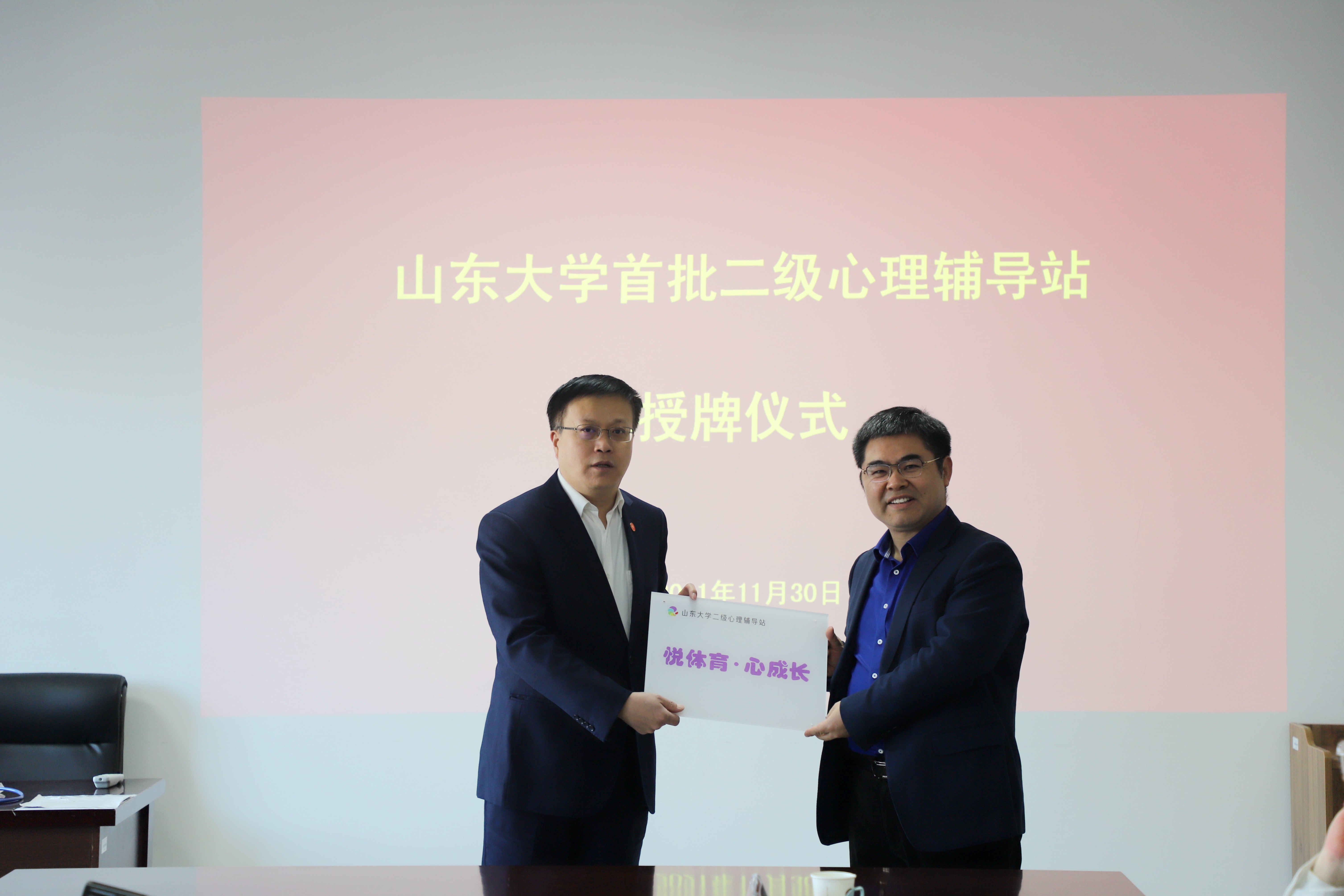 11月30日,在中心校区知新楼B321举行的授牌仪式上,校党委副书记王君松为十大买球的正规网站首批二级心理辅导站授牌,周庆华作为十大买球的正规网站二级心理辅导站负责人参加仪式。