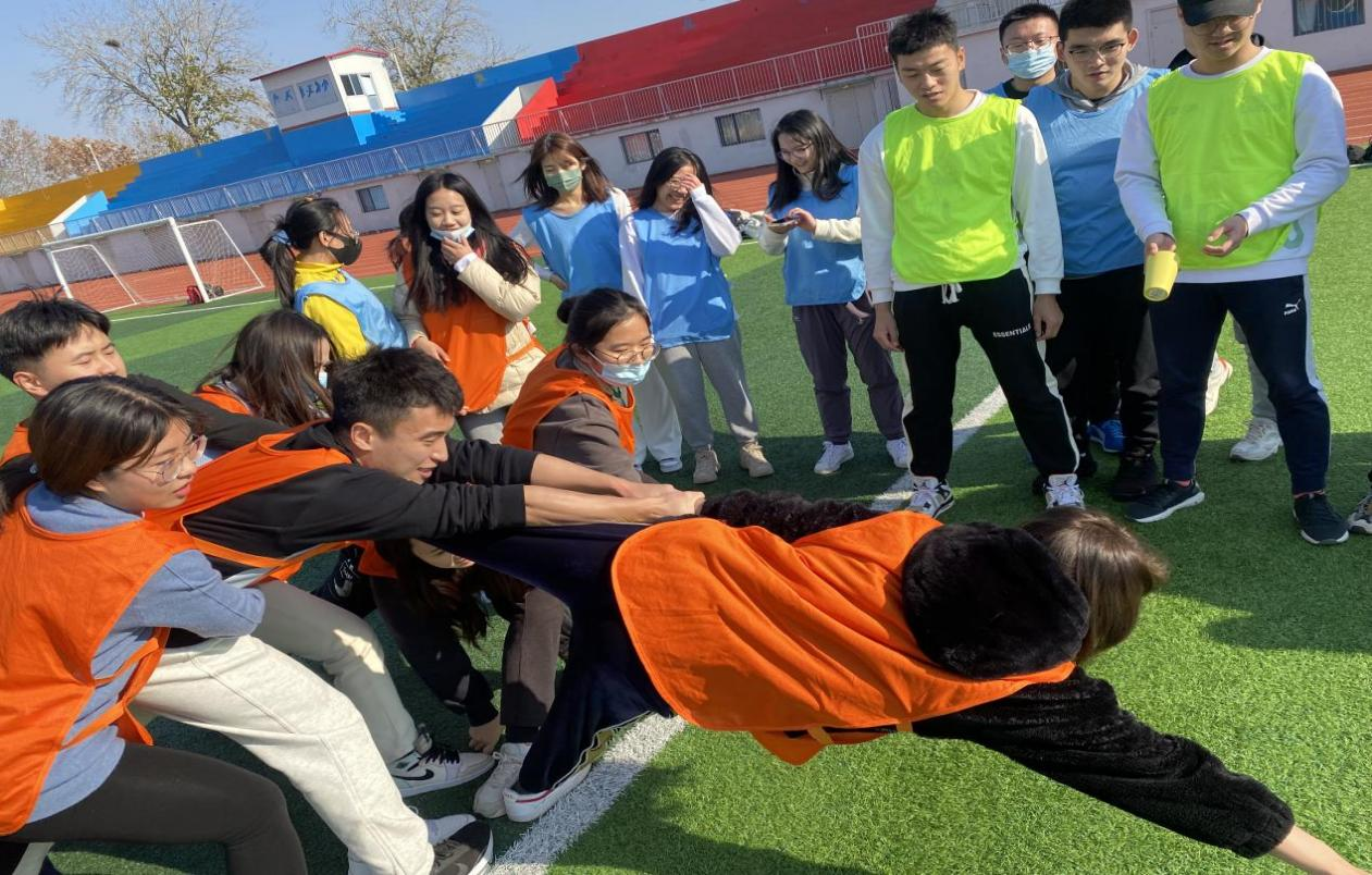 座谈会后,拓展训练活动在千佛山校区田径场举行。专业指导老师首先向同学们普及了素质拓展训练的相关知识和安全事项,然后,将参与人员分为三组,每组推选组长,提出组名和口号,开始游戏竞赛。成员们在老师的指导下分别开展了沙包投掷、双人解绳结和“群龙取水”等游戏,每个小组都团结一致、通力合作,团队配合十分默契,现场气氛热烈。比赛结束后,指导老师讲述了素质拓展活动对增强团体凝聚力、提高创新实践精神的意义,同学们受益匪浅。