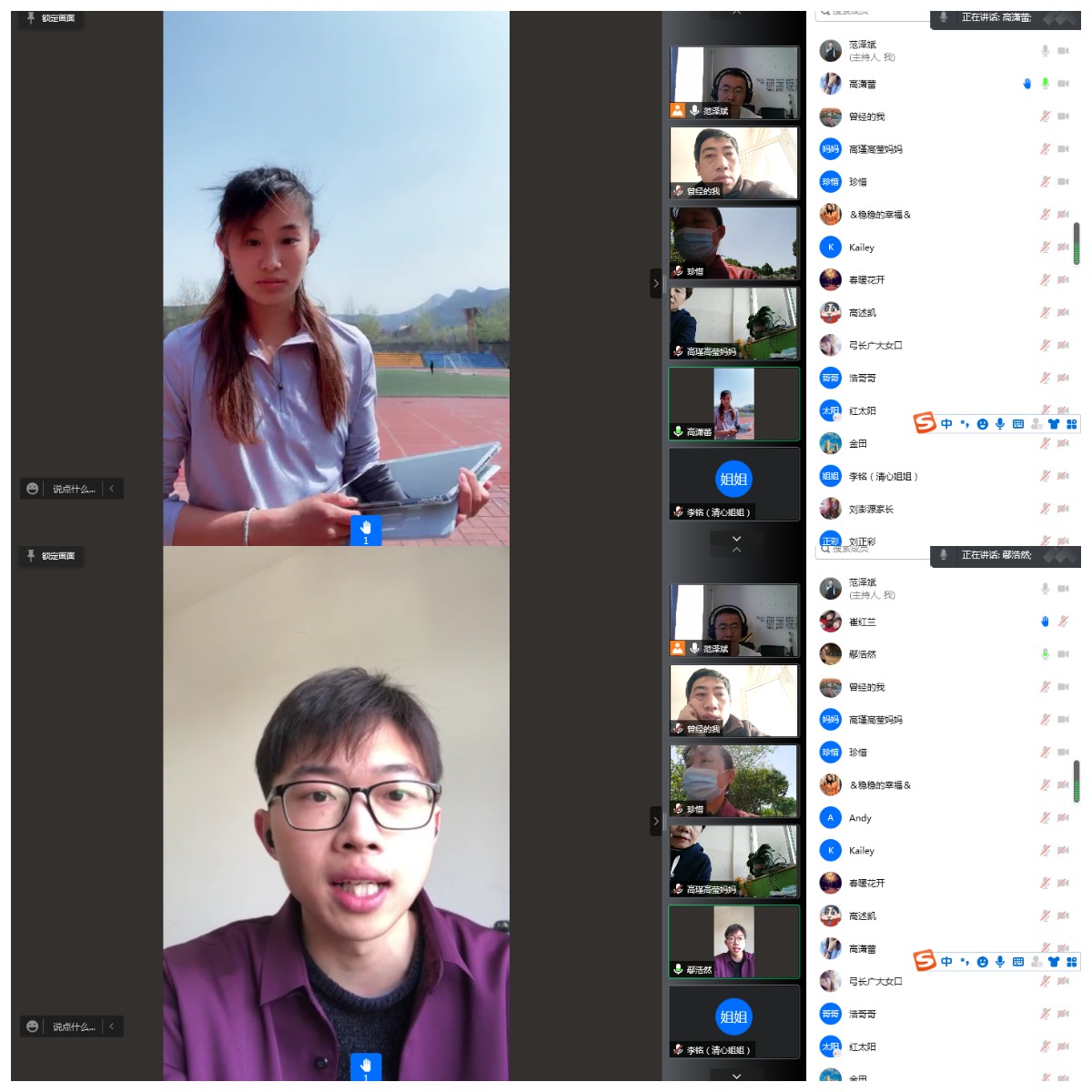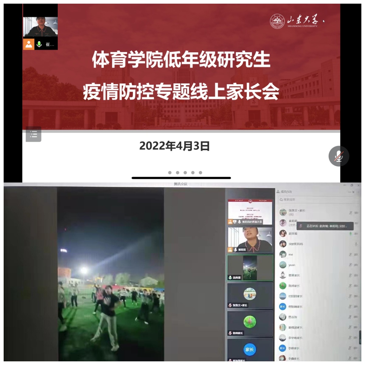 会议上,学院各年级辅导员向家长们介绍了学校目前疫情防控的相关情况,重点交流了当前学校封闭状态下的学生思想状态、管理规定、线上教学和物资保障情况。会上也邀请了几名本科生和研究生代表同学,向家长们介绍了当前同学们的所思、所做、所感,他们分别在教室、运动场地、宿舍向家长实况展示了同学们开展正常学习、生活和训练的情况,让家长进一步放心。