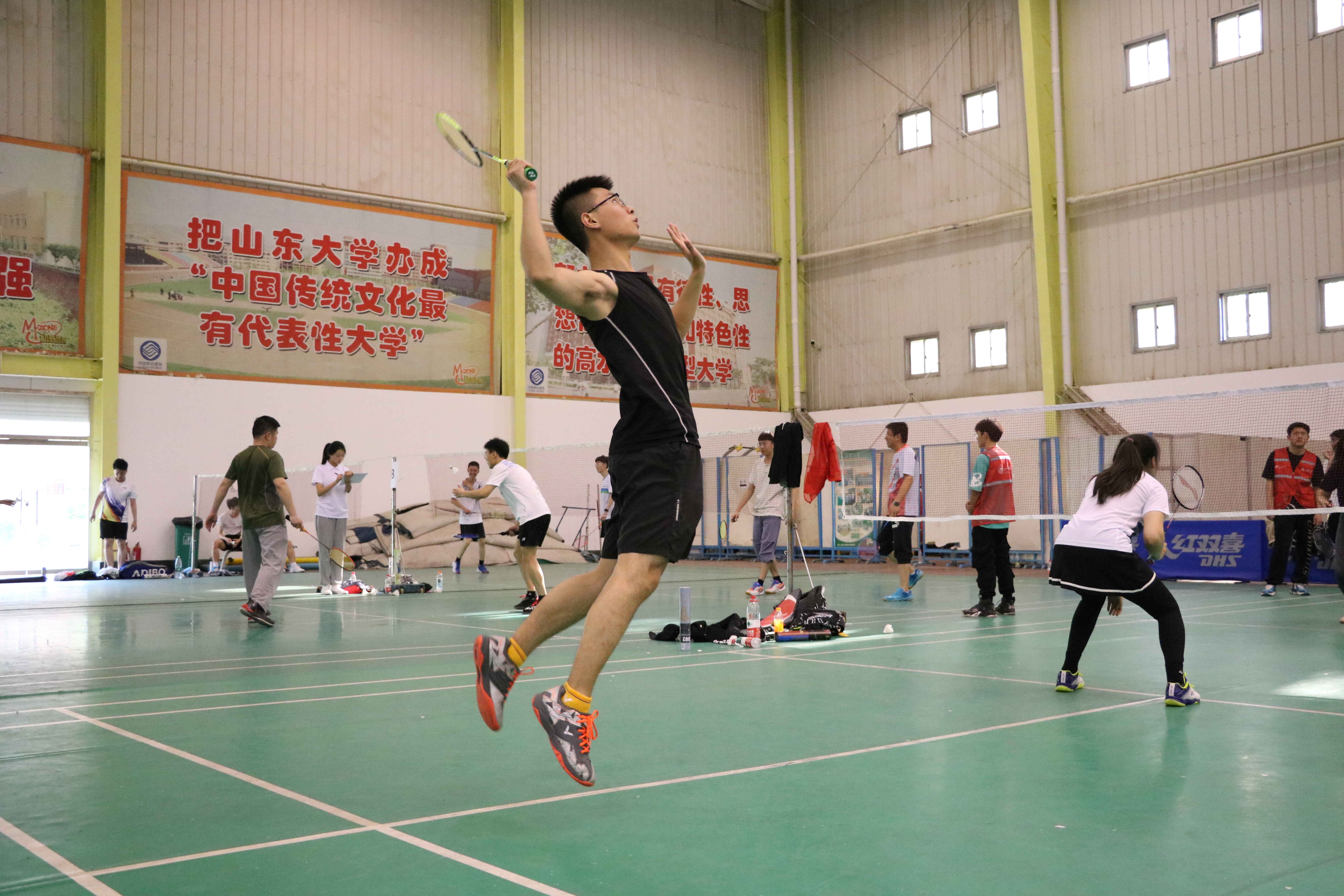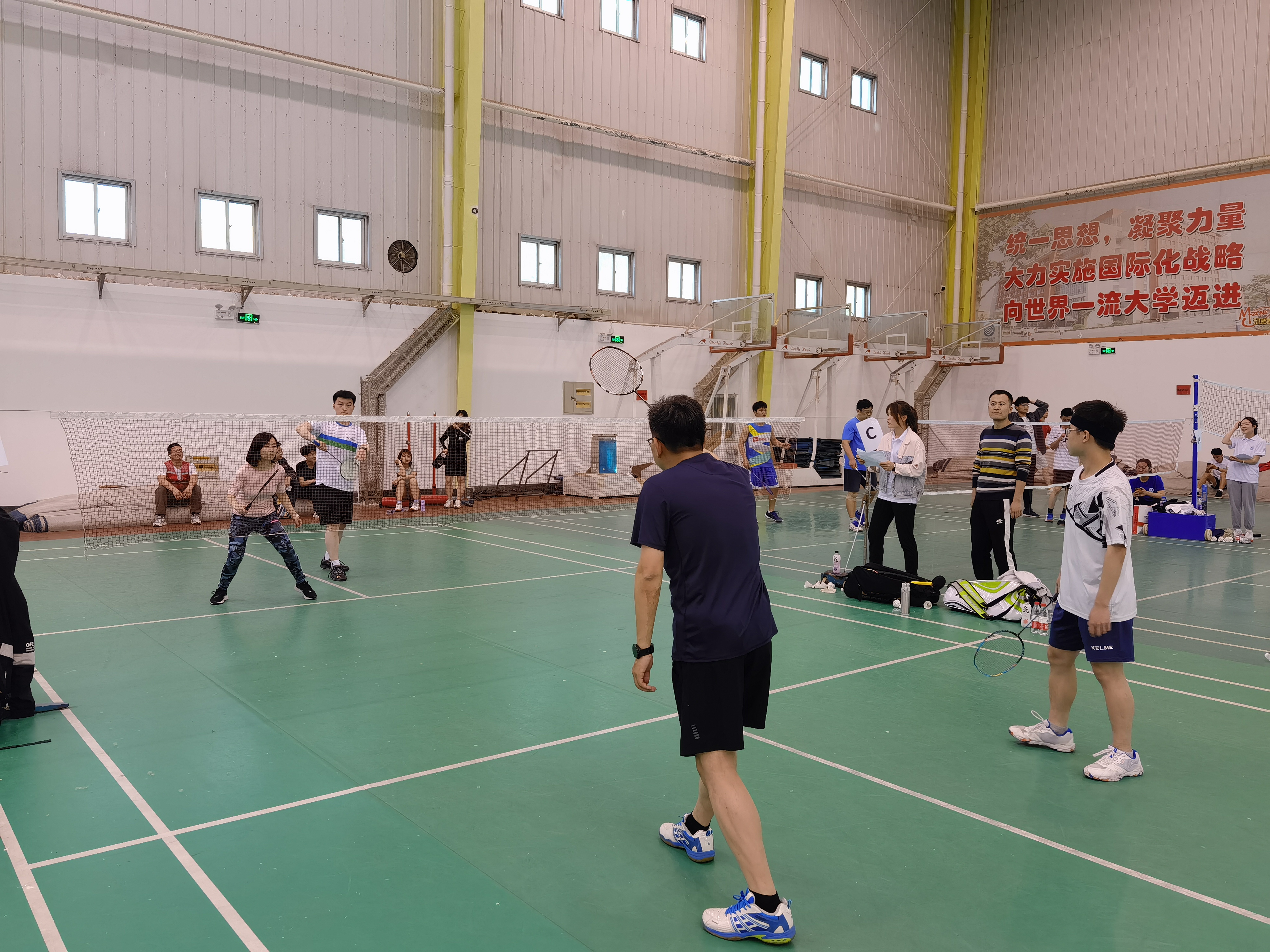 本次比赛共有来自兴隆山校区各单位的30支队伍参赛,每支队伍由一名老师和一名学生组成。比赛按照分组循环积分办法,30支队伍分为8组,每个小组前两名出线。赛场上师生默契配合,互相鼓励,每位选手使尽浑身解数,技巧与力量齐拼,实力与战术互搏,各种高远球、扣球、吊球,劈杀、扣杀等高水平球技频频展现。一次次流畅的攻防转换,一次次默契配合展示了师生高超的体育竞技水平,更展现出队员们坚的定信念和顽强拼搏的精神。