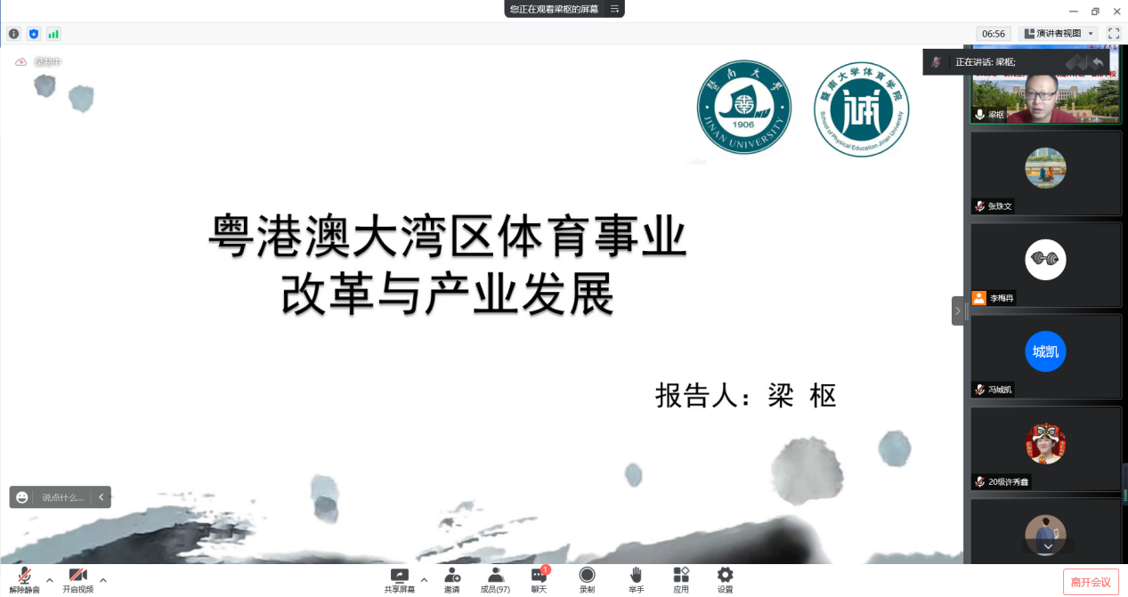 12日上午,优秀校友、暨南大学粤港澳体育非遗研究中心执行主任梁枢副教授进行了以《粤港澳大湾区体育事业改革与产业发展》为题的专题讲座,讲授了在粤港澳大湾区开展相关课题研究中遇到的实际问题以及提出的相关办法。