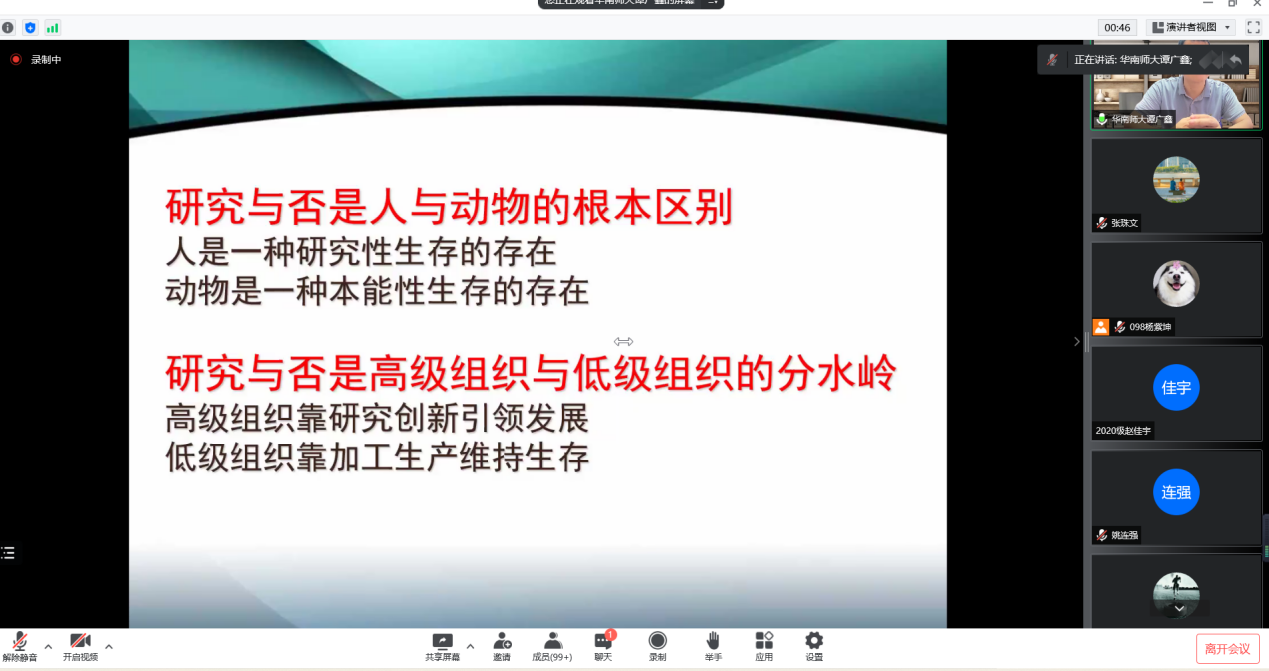 8日下午,华南师范大学博士生导师谭广鑫以《漫谈体育研究生认知能力养成》为题,深入浅出地讲解了体育研究生认知能力的培养,强调了认知对科学研究的重要性。