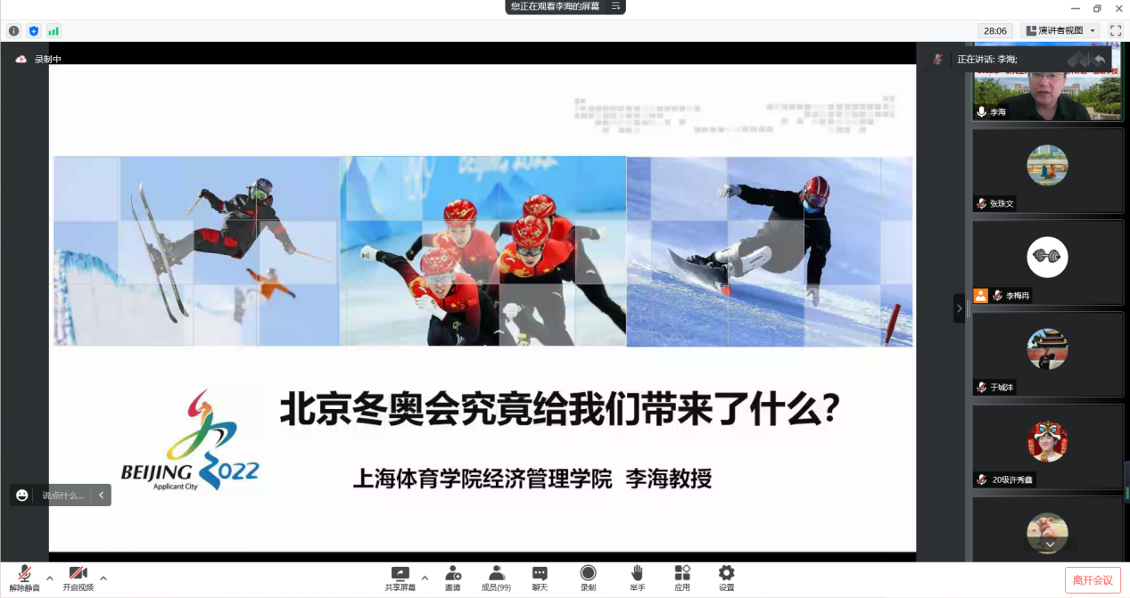 13日上午,上海十大买球的正规网站经济管理学院院长李海教授受邀作了题为《北京冬奥会究竟给我们带来了什么》的主题讲座。就中国为什么要申办冬奥会进行分析讨论,提出申办冬奥会是提升国家形象的重要途径,同时指出冬奥会的举办进一步完善了我国城市基础服务设施、引导了城市空间合理布局,全面提升了城市综合服务功能体系的建设,为城市就业、住宅、交通等方面带来了巨大收益。