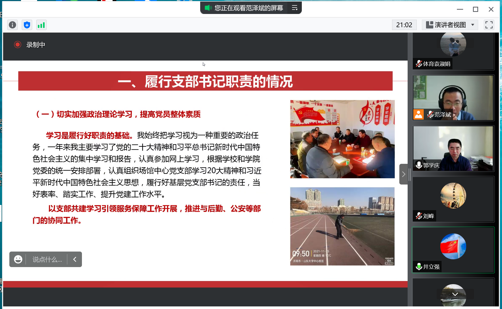 会议通过线上方式召开,学院10个基层党支部书记依次进行了年度述职汇报。大家聚焦坚持和加强党的全面领导、履行基层党建工作责任、推动提升基层党组织政治功能和组织力,进行了工作述职。重点从加强政治建设、思想建设、组织建设、作风建设和纪律建设等方面开展了工作总结,围绕本年度迎接和学习宣传党的二十大精神、安全专项巡视整改、推进学校体育育人等重点工作进行总结述职。述职中各党支部书记深入查摆分析本支部在基层党建工作中的突出问题和本人在履行抓基层党建工作责任中存在的差距和不足,并提出2023年加强基层党建的工作思路、重点任务和解决问题的措施办法。每一名支部书记述职后,联系支部的党委班子成员结合日程掌握情况进行了对应点评,学院党委书记郭学庆采取“一述一评”的方式逐一点评。