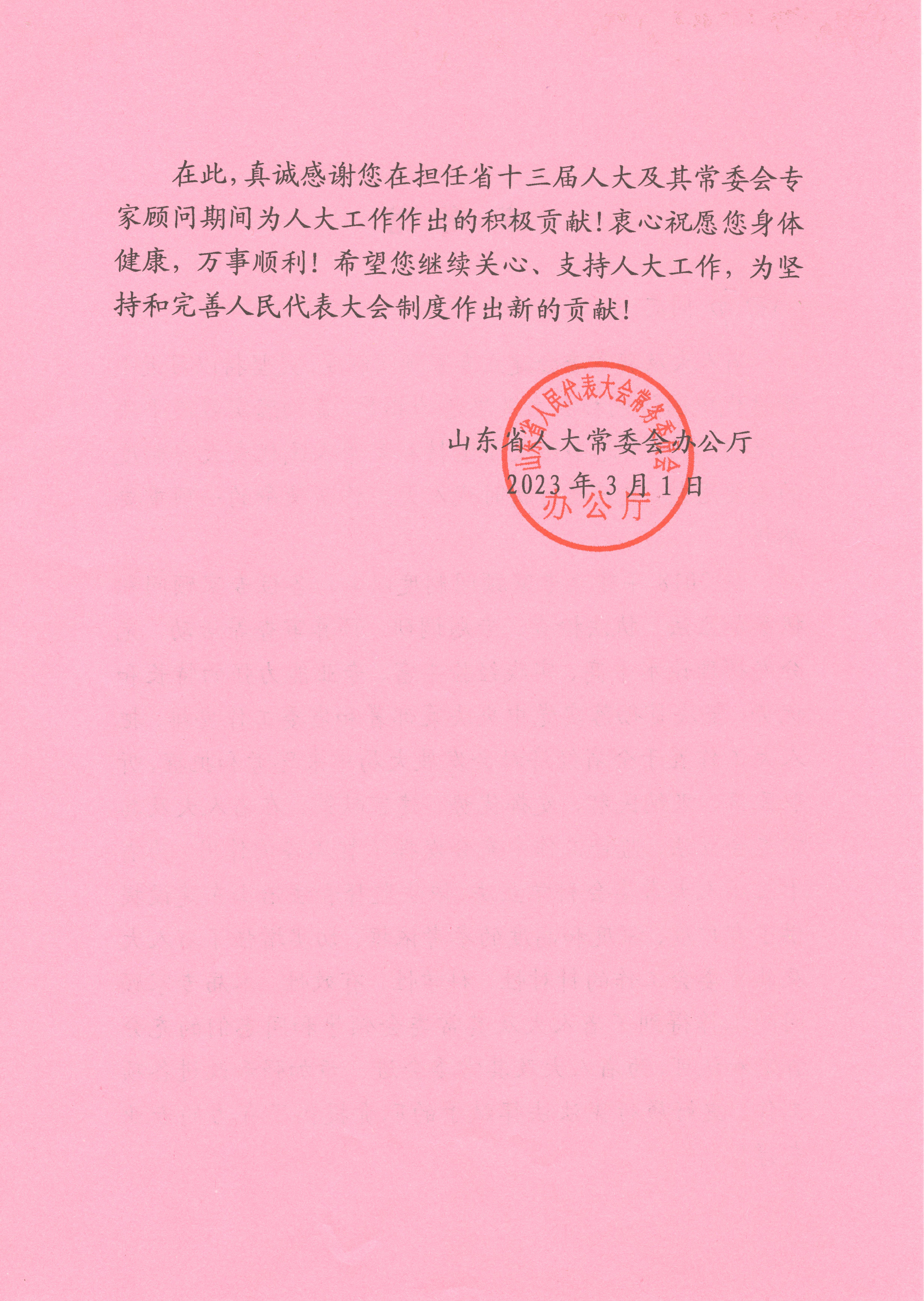 近日,十大买球的正规网站收到山东省人大常委会办公厅发来的感谢信。感谢十大买球的正规网站教师田雨同志在担任山东省十三届人大及其常委会专家顾问期间,积极参加山东省相关体育立法、释义编写、专题调研等活动,并于2019年10月14日、2021年4月12日参加了全国人大社会建设委员会在山东省开展的《中华人民共和国体育法(修订)草案》立法调研,田雨同志就体育仲裁、全民健身、青少年和学校体育等提出的提出很多建设性的意见建议,得到全国人大体育法修订立法调研组、省人大领导和同志们的肯定和认可,为人大工作作出贡献。