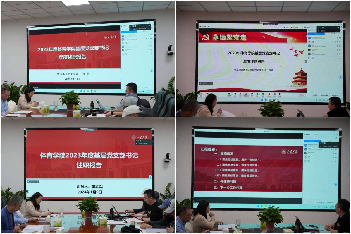 会议以线上线下相结合的方式召开,学院13个基层党支部书记和负责人依次进行了年度述职汇报。大家聚焦坚持和加强党的全面领导、履行基层党建工作责任、推动提升基层党组织政治功能和组织力,重点从加强政治建设、思想建设、组织建设、作风建设、纪律建设、制度建设等方面开展工作总结,围绕本年度开展主题教育、学习贯彻落实党的二十大精神、推进学校体育育人等重点工作进行总结述职。会上,大家深入查摆分析本支部在基层党建工作中的突出问题和本人在履行抓基层党建工作责任中存在的差距和不足,把解决党支部战斗堡垒作用发挥不突出等突出问题作为述职评议的“必答题”。根据查摆问题,各支部书记提出2024年加强基层党建的工作思路、重点任务和解决问题的措施办法,明确要着力抓好的重点工作、采取的主要推进措施。每一名支部书记述职后,联系支部的班子成员结合日程掌握情况进行了对应点评,学院党委书记郭学庆采取“一述一评”的方式逐一点评。