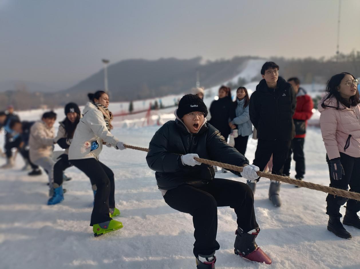 在雪地拔河环节中,研究生们分成多队进行激烈的角逐。拔河采用淘汰赛制,正常比赛比拼非常激烈,喝彩声不断,队员们热情高涨。呐喊声、欢笑声响彻整个滑雪场,将活动气氛推向了高潮。