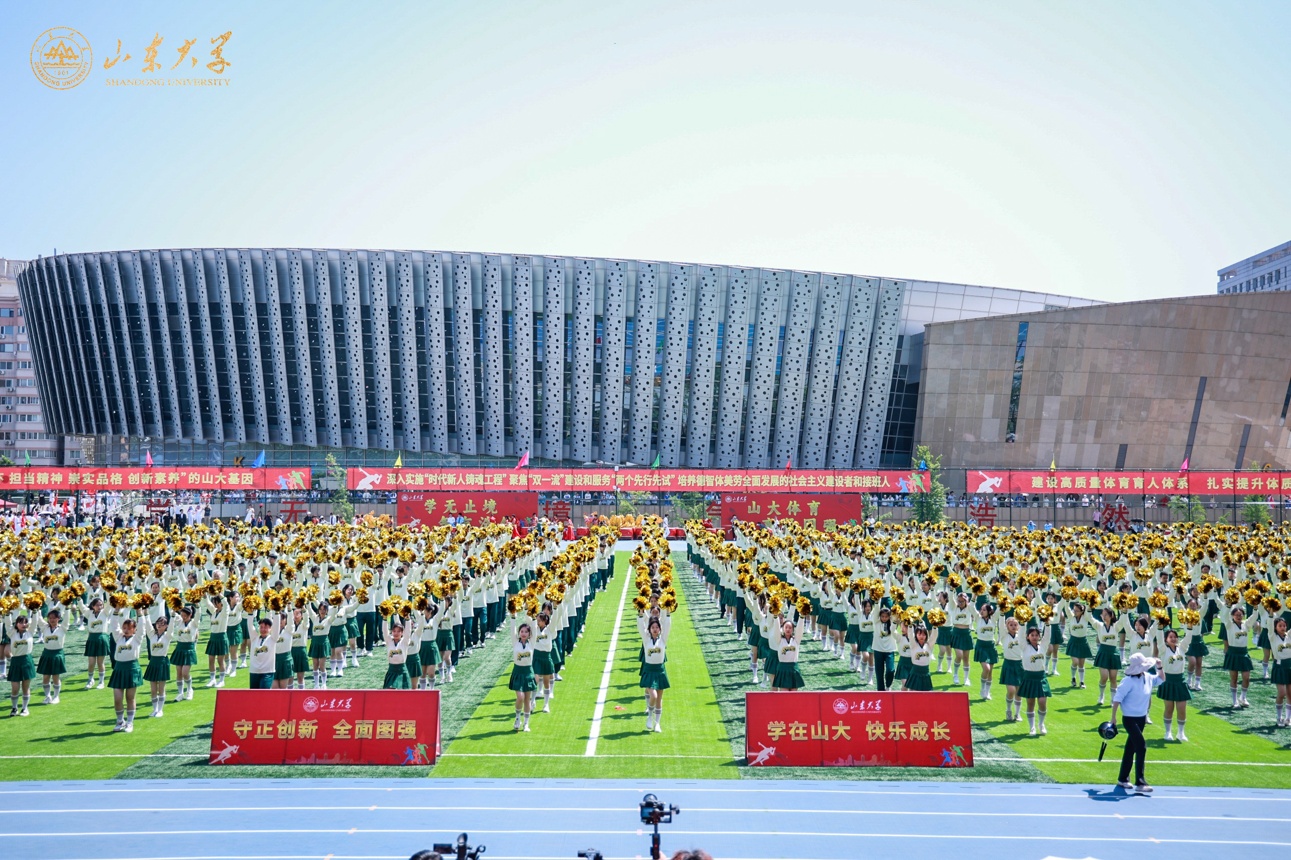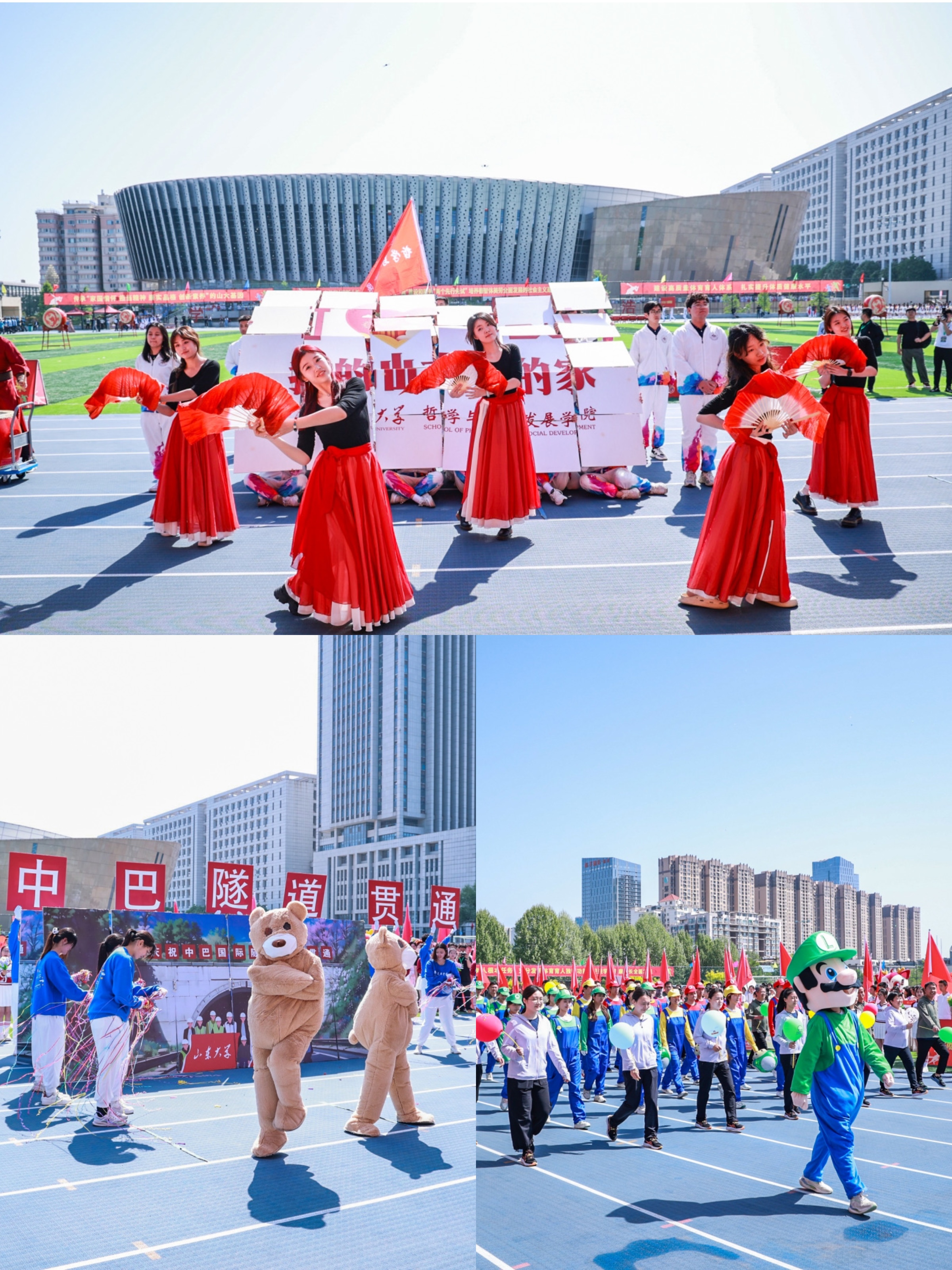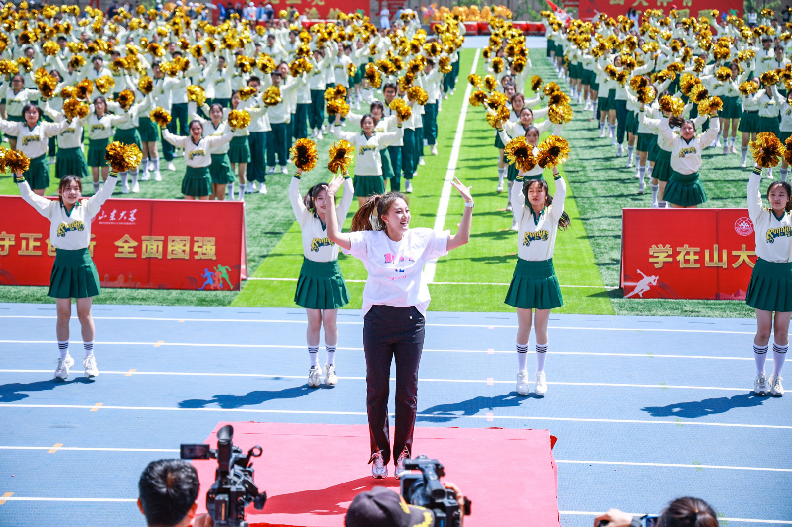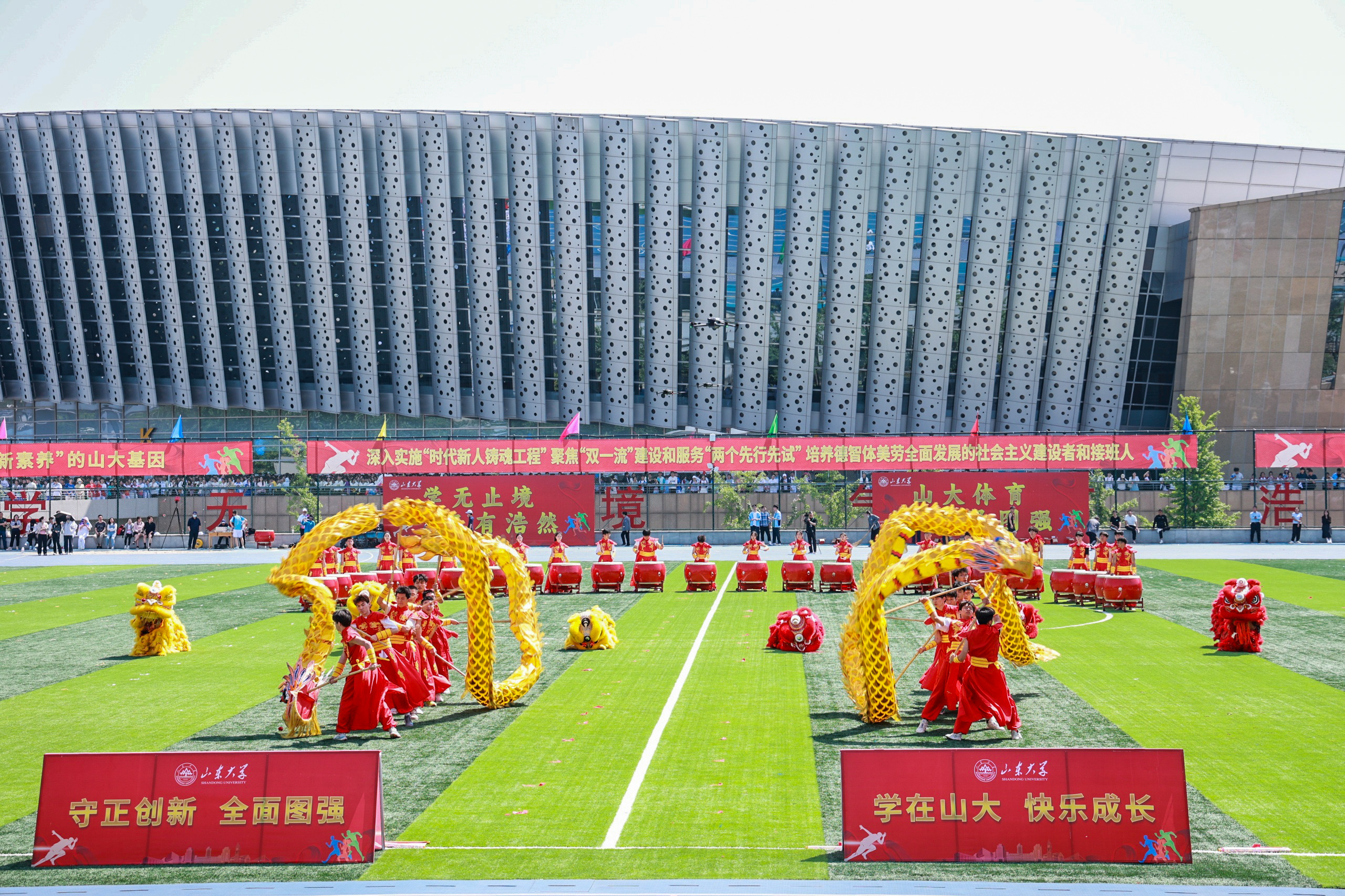 任友群宣布运动会开幕,精彩的舞龙舞狮打击乐团体表演拉开团体操表演的的序幕,“龙腾虎跃势图强,奋楫逐梦谱华章”,来自十大买球的正规网站、艺术学院的80余名学生秉承中华龙狮精神、伴随铿锵有力的鼓点,一同奏响新时代“山大图强”的炫彩华章;“武”旗表演——雏鹰展翅、壮志飞扬,电气学院、材料学院、土建学院、齐鲁交通学院的500名学生手持红旗,“武”动青春,汇聚成一道波澜壮阔的风景线;四位教师联袂编创,五个校区十九个学院共900余名健美操选修课学生倾情演绎“春山莫负,舞动青春”,舞姿优美,健美的身影在绿茵场上热烈激昂。