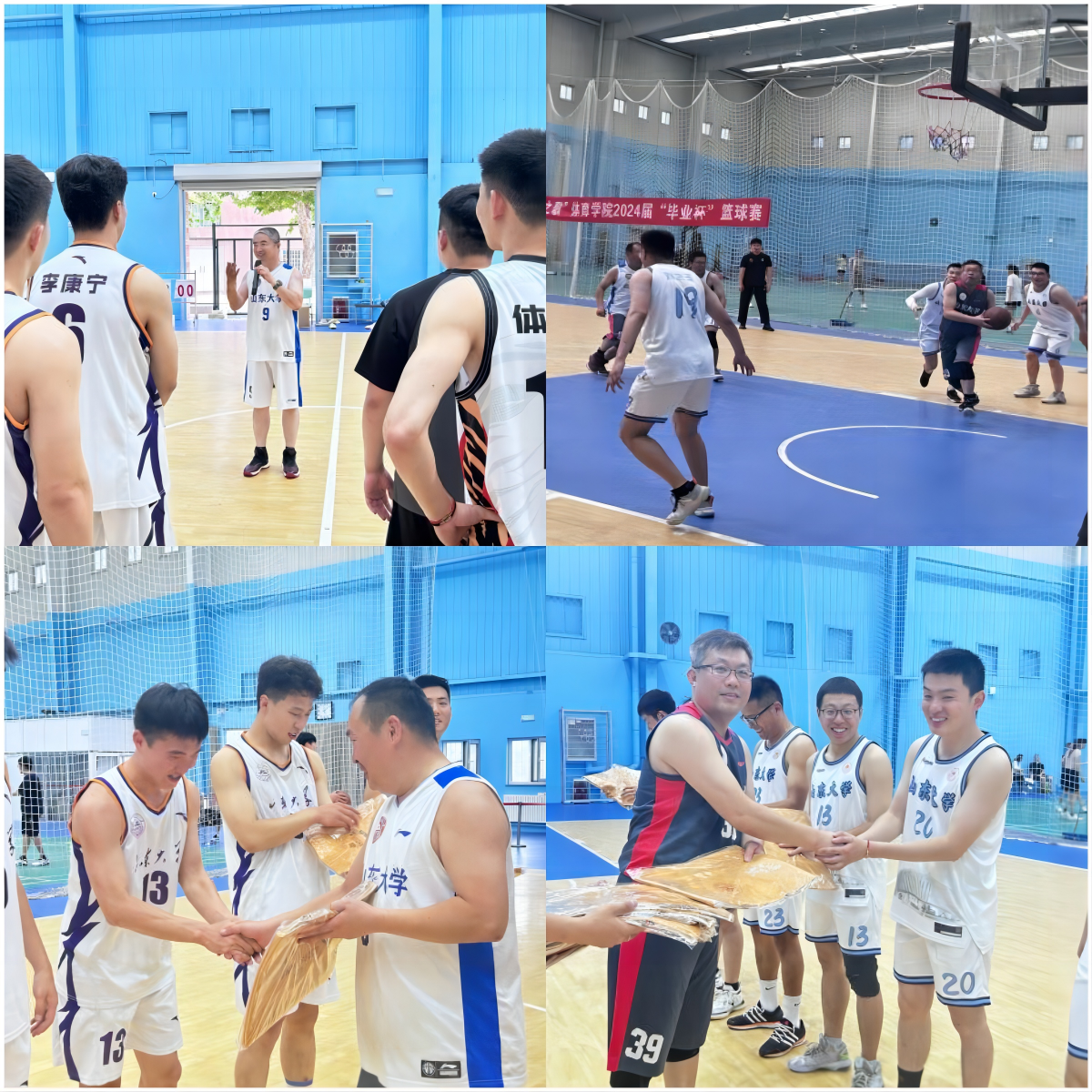本次比赛有研究生联队、教师队、研究生毕业班队以及本科生毕业班队四支队伍,以循环赛的方式进行。各只队伍在球场上都展现了高超的球技和默契的团队配合。比赛中,双方队员你来我往,激烈争夺,每一次投篮、每一次盖帽、每一次抢断都引起了观众的阵阵欢呼。裁判员们高度专注,认真裁决,确保了比赛的公正性和准确性,保证了比赛的顺利进行。中场休息时,主办方为大家安排了女生投三分球,男生半场球等趣味篮球活动,为紧张的比赛增添了一抹轻松愉快的色彩,也进一步加深了师生之间的情谊。活动结束后,王先亮、杨尚剑为毕业生颁发奖品。