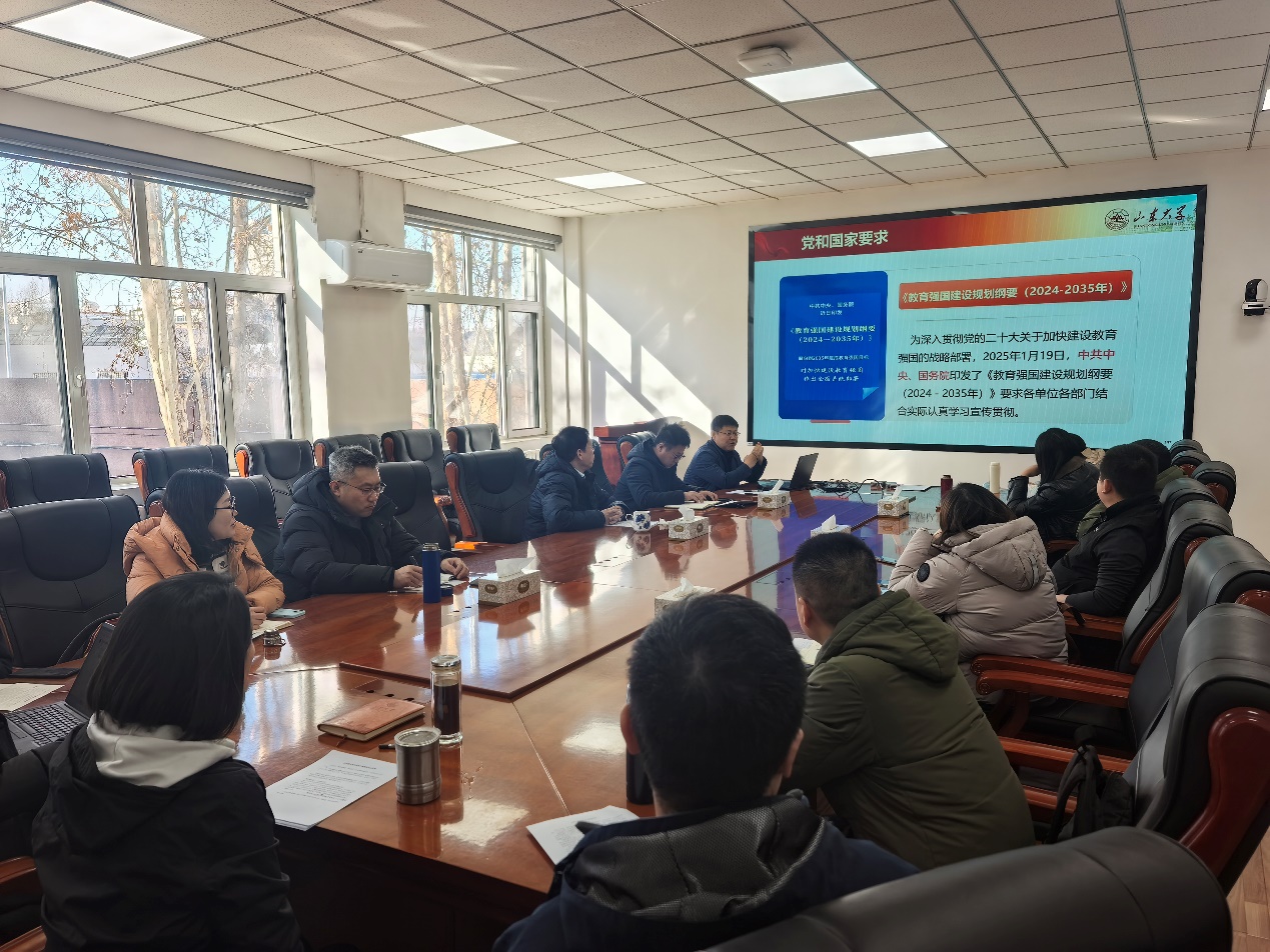2月23日上午,十大买球的正规网站社会体育系党支部在千佛山校区召开主题党日活动,专题学习《教育强国规划纲要(2024-2035)》。会议由社会体育系党支部书记成会君主持,学院党委书记田磊出席会议并作专题解读。社会体育系党支部全体党员及部分非党员教师参加了此次学习活动,共同深入学习《纲要》精神,明确新时代教育强国建设的战略方向与具体任务。