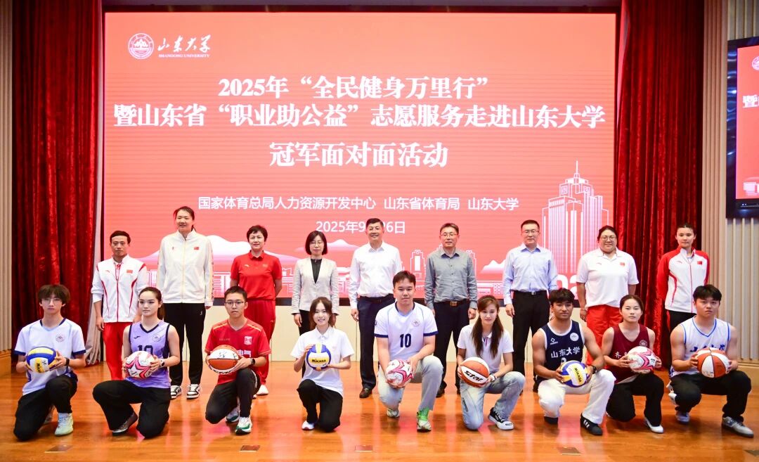9月26日,“全民健身万里行”暨“山东省职业助公益”走进十大买球的正规网站志愿服务活动举行。本次活动将全民健身的热潮与冠军榜样的力量带入校园,奥运会个人冠军、我国射箭史首枚奥运金牌得主张娟娟,三届世界冠军、武术大满贯运动员孙培原,女子10公里马拉松游泳全运会三连冠、世界游泳锦标赛冠军辛鑫,排球奥运会冠军杨方旭,世界举重锦标赛冠军周璐璐来校与师生面对面交流,张娟娟、孙培原分别做《弦响人生:从靶心到内心的冠军之路》《青春逢盛世,拼搏正当时》的主题演讲,为山大学子带来了一场关于梦想、拼搏与成长的励志课堂。张帅在致辞中表示,希望广大师生用心聆听冠军们的奋斗故事,深刻感悟他们不畏艰难、勇攀高峰的精神;认真学习专家的科学健身知识,掌握保持健康的有效方法;将体育精神内化于心、外化于行,带动身边更多的人动起来、练起来,共同为体育强国、健康中国建设注入青春力量。
