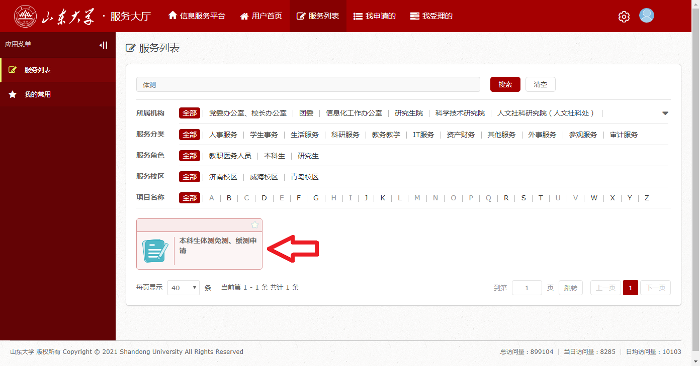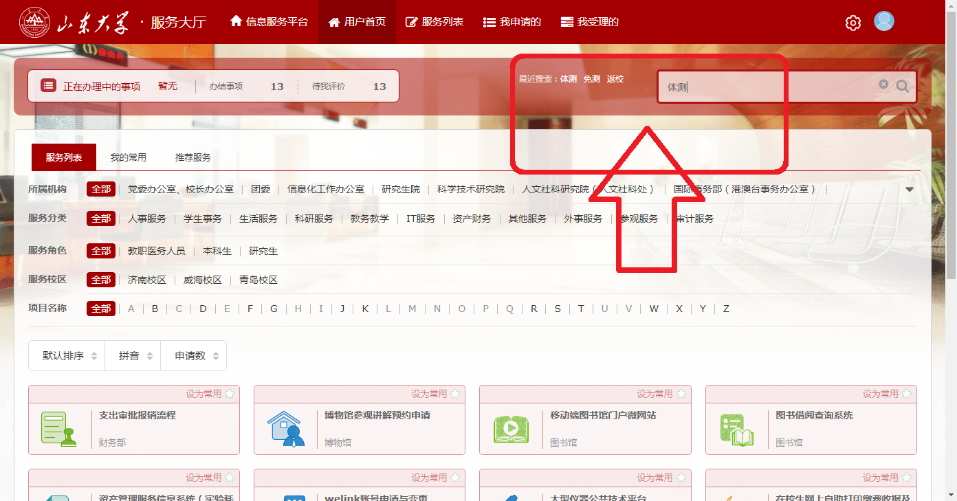 第二步: 点击【服务大厅】 →在右上角的搜索框中搜索“体测”。