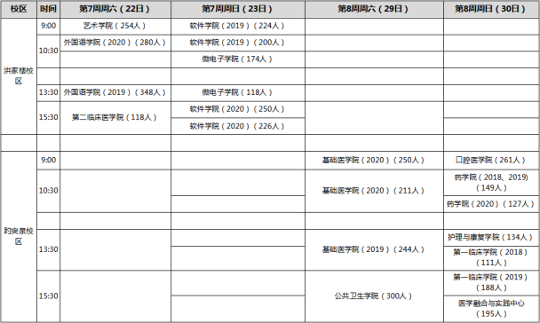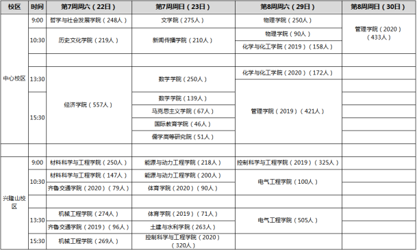 由各学院辅导员组织,按照规定时间集中测试,测试时间第七周、第八周周末(10月22日-23日;10月29-30日),具体安排见下表。各校区入场截止时间:上午11:30,下午17:00.