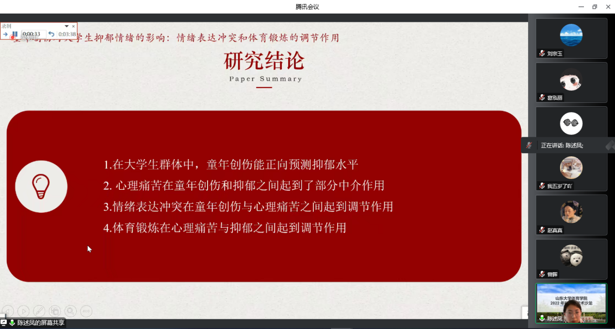 为加强校园学术文化建设,促进研究生学术交流,营造学术创新氛围,提高研究生培养质量,十大买球的正规网站于12月20日通过线上腾讯会议方式举办“学业·学术·学者·学风”研究生学术沙龙比赛活动。本次活动采用线上报告的形式,邀请2019级博士研究生王志文,2020级博士研究生罗亮,2021级博士研究生巫前锦、刘文昊、谷倩进行评审。活动由2022级硕士研究生葛泓丽主持,十大买球的正规网站全体研究生参与聆听了系列报告。
